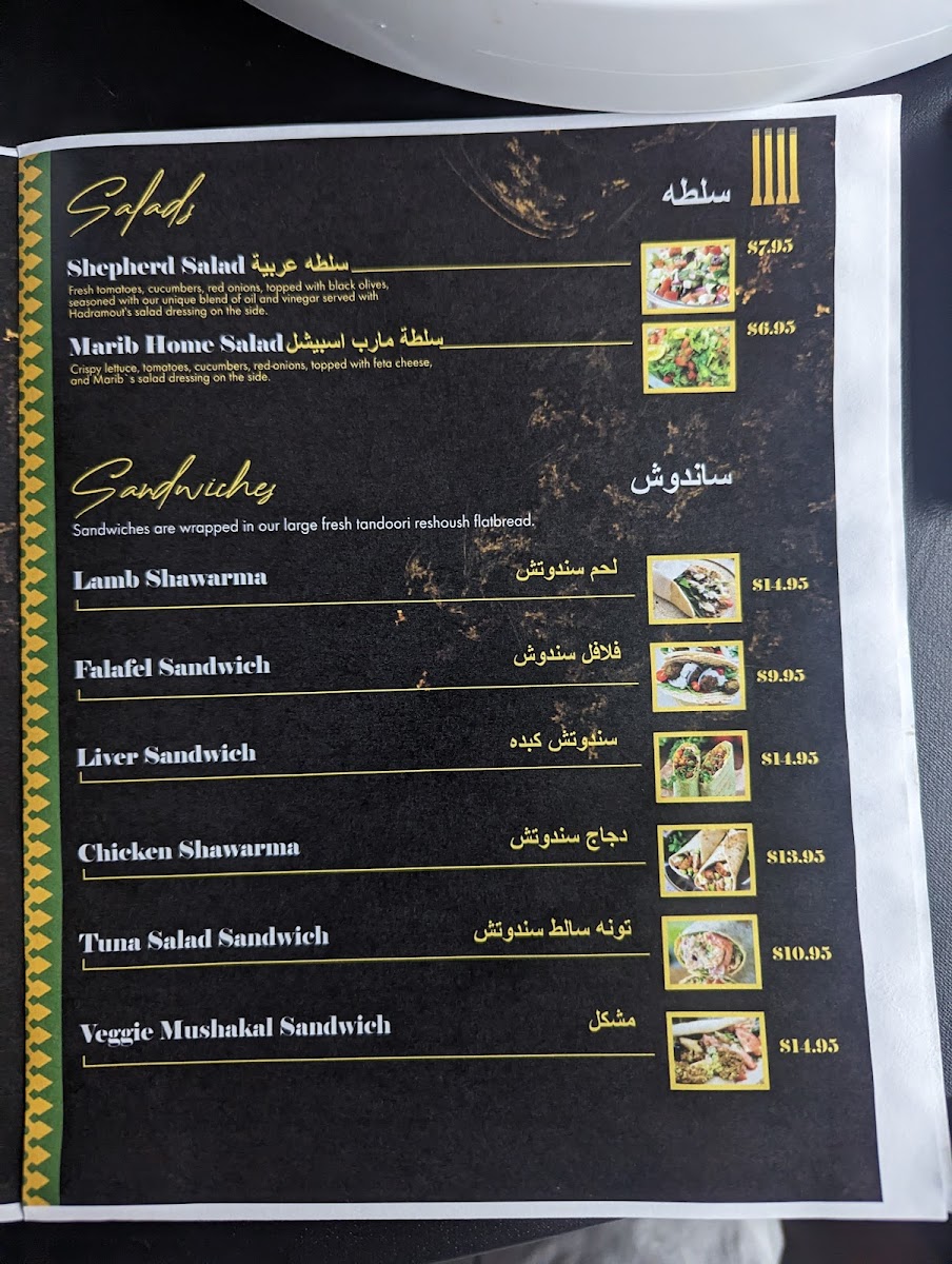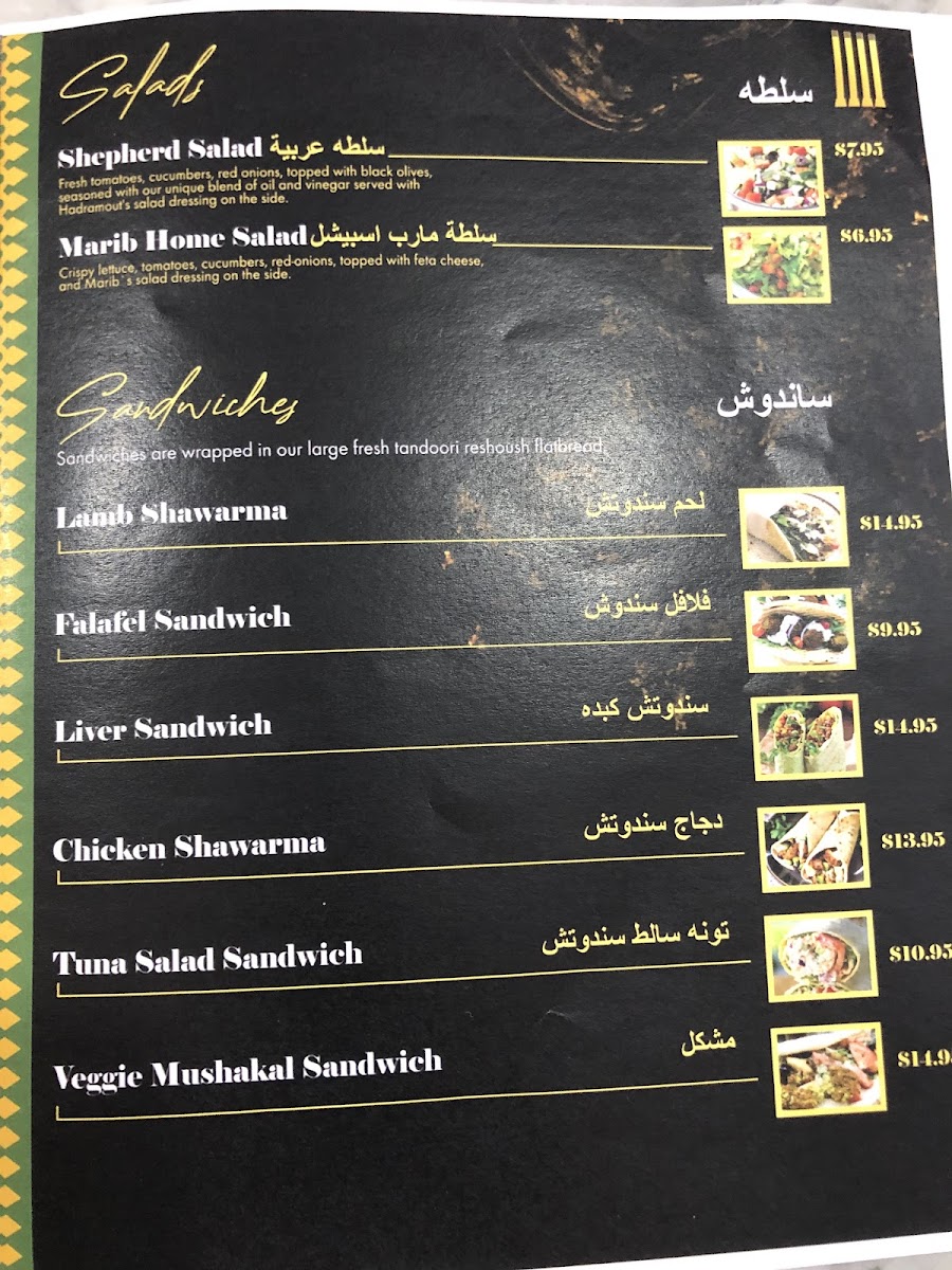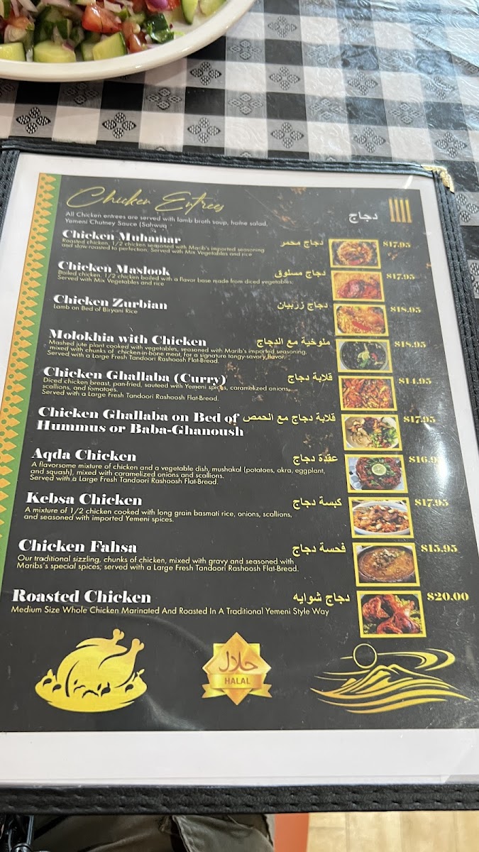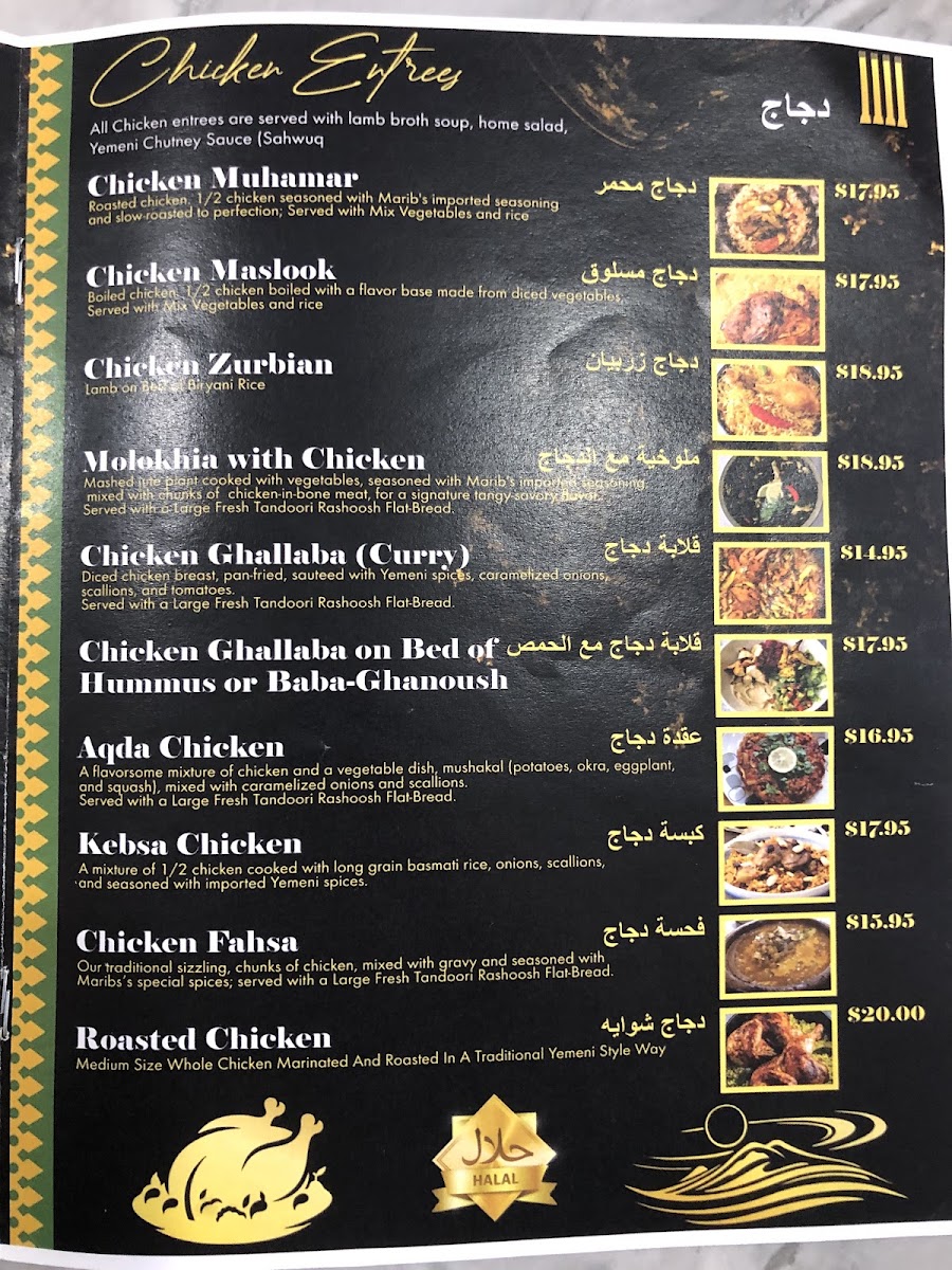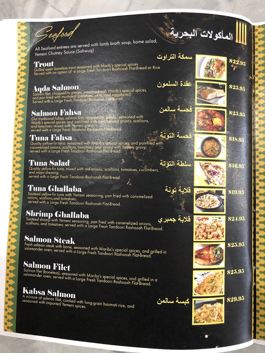 Our traditional fahsa, salmon filer,chopped to pieces, seasoned with Marib's special spices, and pan-fried with caramelized onions, scallions. Served with a large fresh tandoori rashoosh flat-bread.