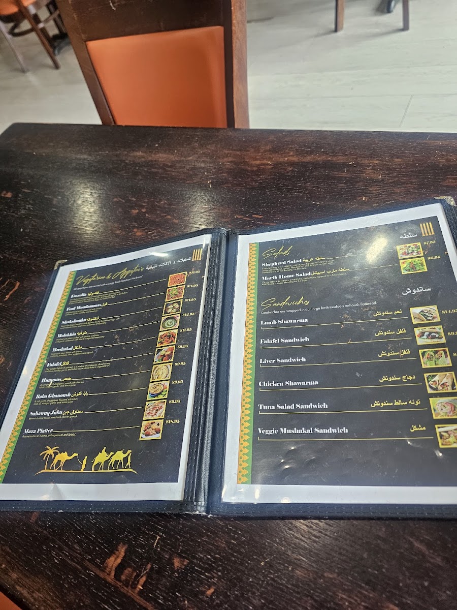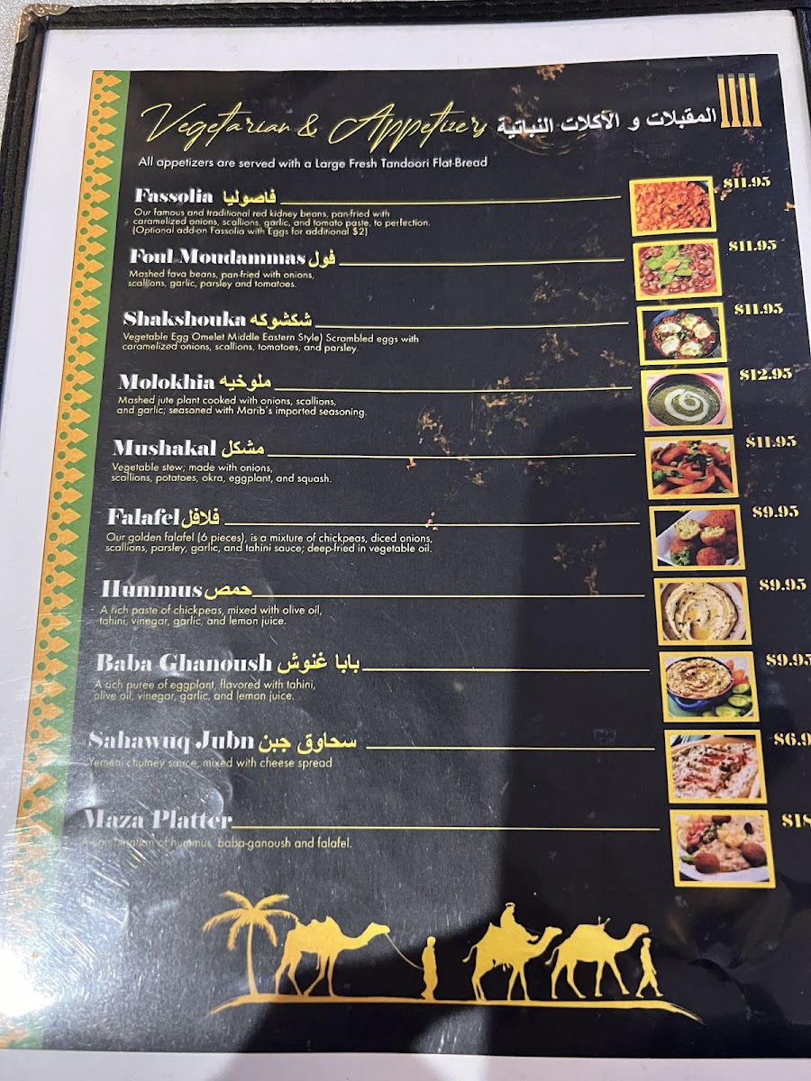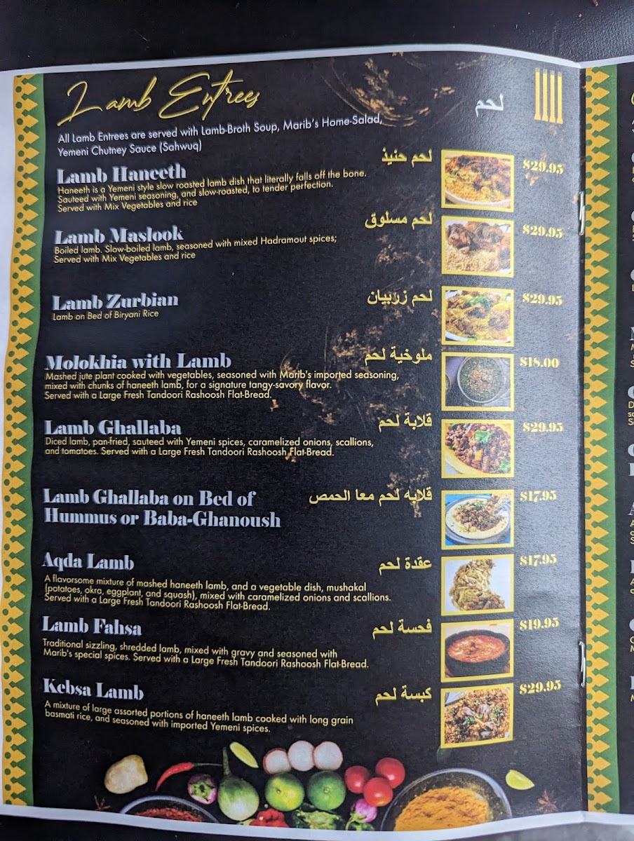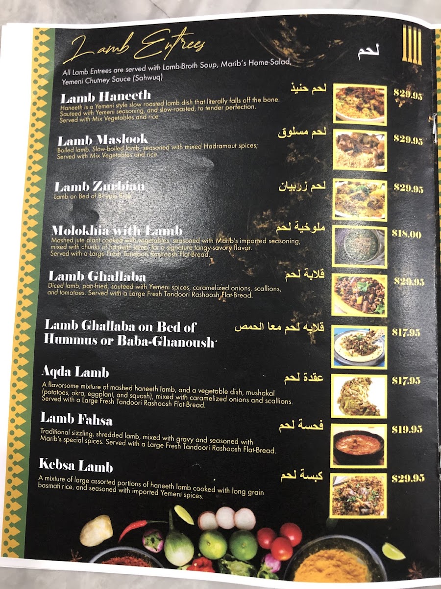 Salmon filet, chapped to pieces, seasoned with Marib's special spices, and pan fried with mushakal (patatoes, okra, and eggplants). Served with a large fresh tandoori rashoosh flat-bread.